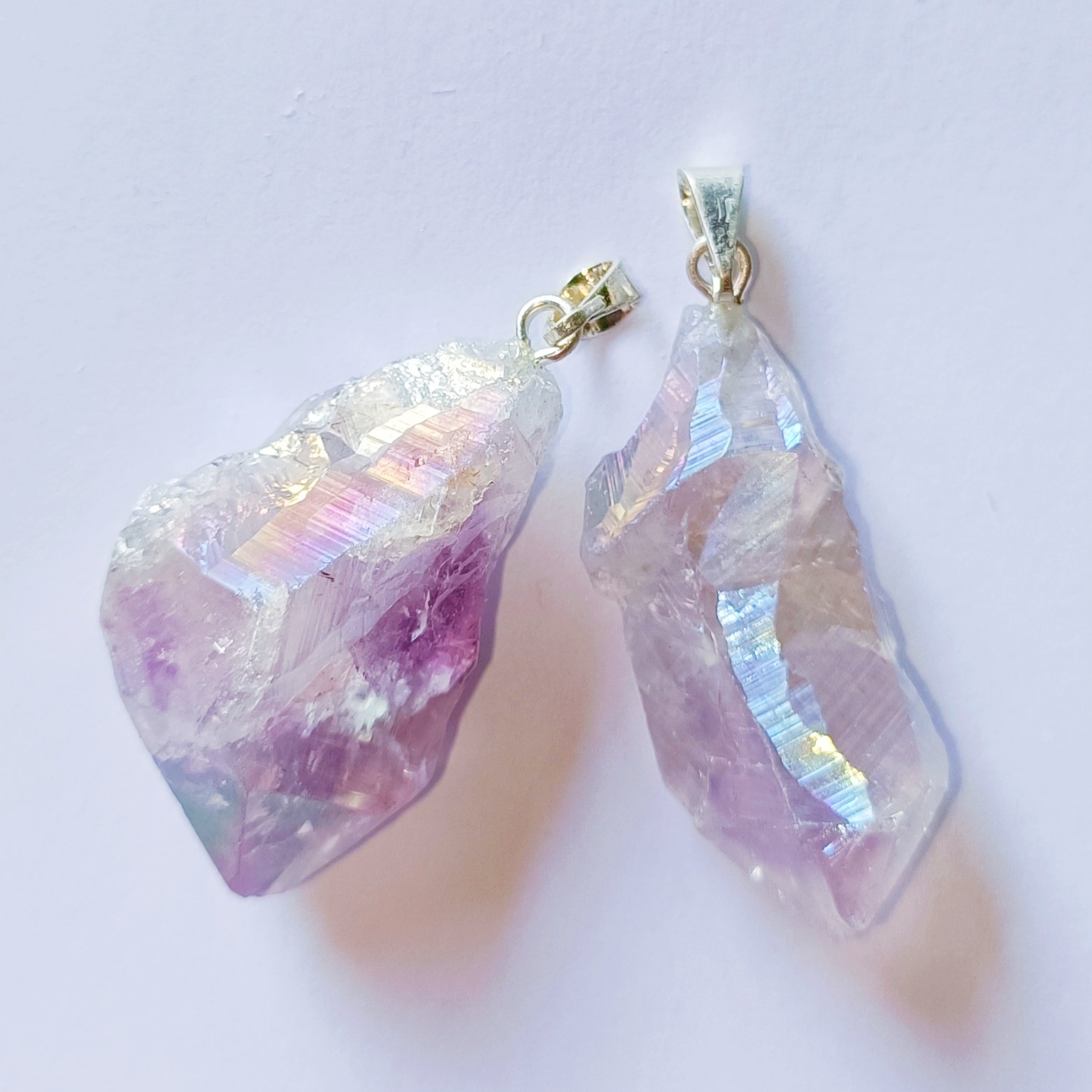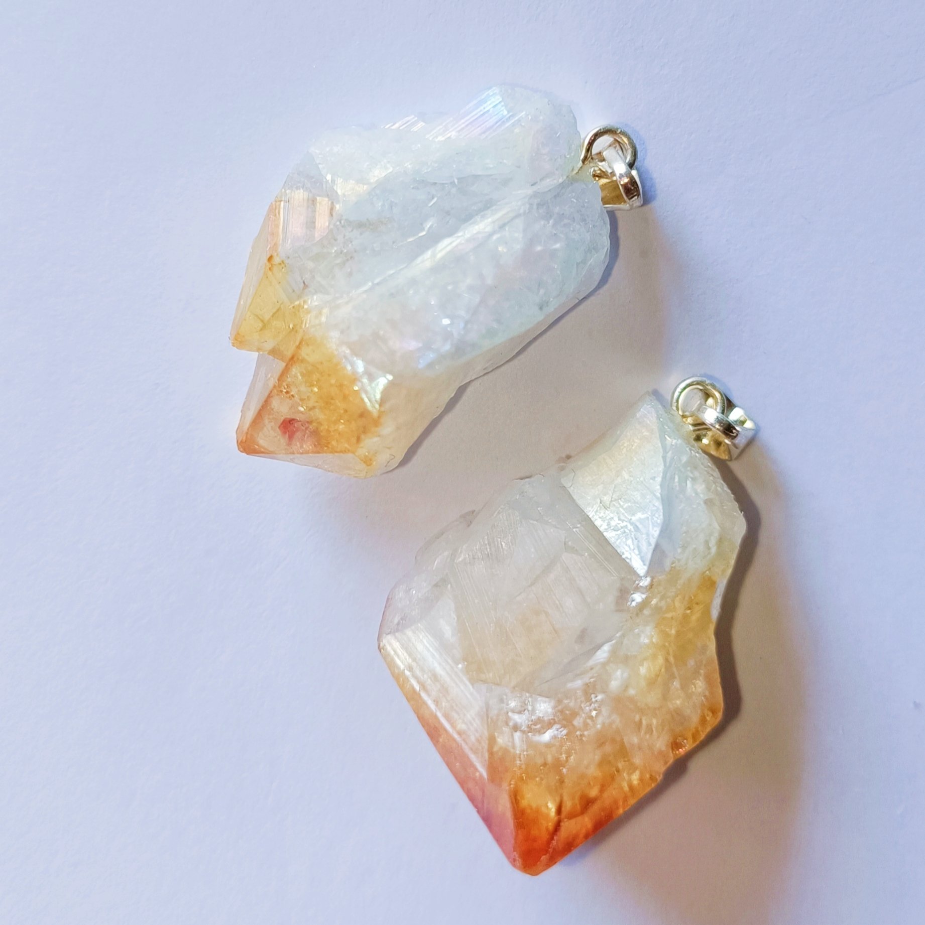 Bring balance, energy, and beauty into your daily life with our Citrine & Amethyst Aura Crystal Pendant. Each pendant is crafted from natural raw aura-treated crystals, shimmering with iridescent tones of gold, orange, and subtle violet highlights.